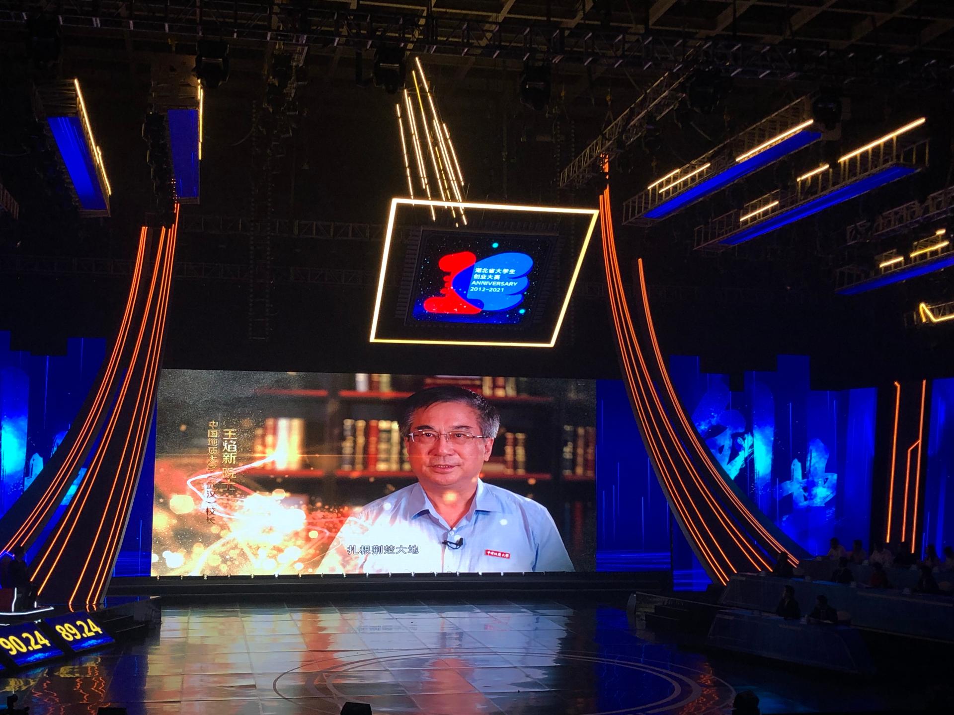 在读博士生王中鹏颁奖。校长王焰新院士通过现场视频为创业连环夺宝游戏