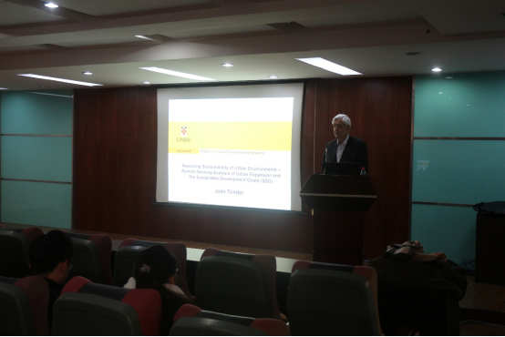 首先,Trinder教授对什么是可持续发展进行了讲解,从社会、经济和环境三个方面引入了可持续性指标,并对城市区域的可持续性、城市环境绿度空间的重要性以及绿地碎片化的影响的评价原则进行了介绍。随后,Trinder教授重点介绍了利用1987年至2017年遥感卫星对武汉与悉尼两座城市的城市化影响进行了回顾和研究,并展示了相关研究成果。这些结果也与世界上正在进行的相关研究成果进行了比较,令在场的研究生深受启发。最后在提问环节,Trinder教授回答了参会老师及学生提出的问题,并对大家提出了宝贵的建议。