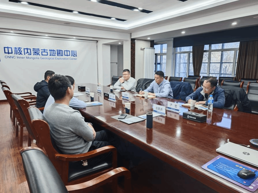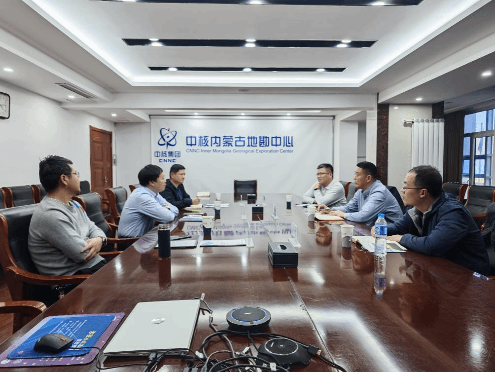 党委书记马彦周、副院长严哲、固体地球物理系教师黄荣与中核二〇八大队党委书记苏锐、部门负责人剡鹏兵、李喜彬进行座谈。